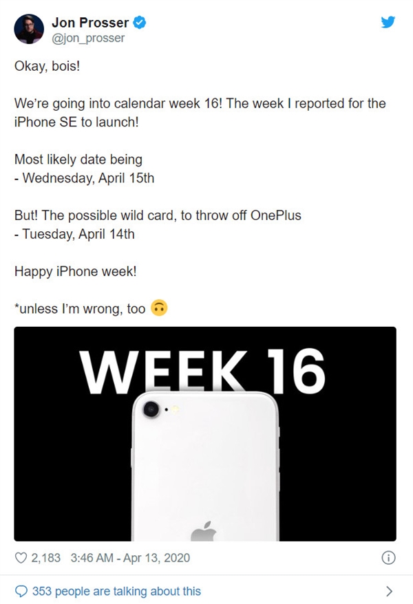 此前,外媒报道称, 2020 iPhone SE最快将于本周发布。国外爆料人Jon Prosser带来最新消息称,苹果极有可能在4月15日发布这款入门iPhone。新款iPhone SE之所以备受关注,是因为超低价,且被认为是iPhone 6系列用户的最佳换机选择。