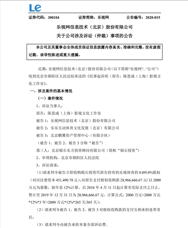 据悉,此次被告方一共有3位:乐视网信息技术(北京)股份有限公司、乐乐互动体育文化发展(北京)有限公司、北京鹏冀资产管理中心(有限合伙)。
