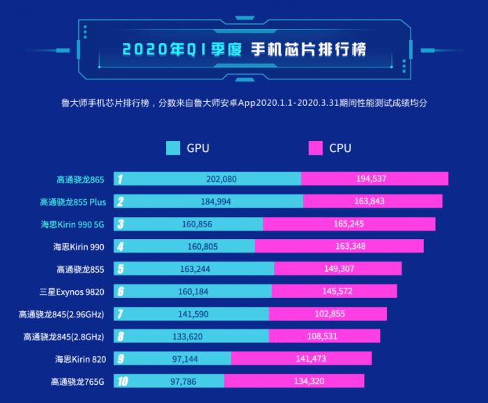 鲁大师表示,要说骁龙865摘得2020年Q1季度安卓手机芯片的冠军,相信大多人都没后异议。从Q1手机综合性能榜中我们不难发现,所有上榜的手机均搭载了骁龙865,已经达到“霸榜”的地步。