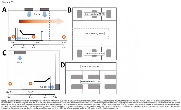 研究人员在地板上以及医生的鞋底上发现了新冠病毒。他们在医院药房的地板上发现了病毒的痕迹,那里没有COVID-19患者。他们还在所有工作人员和病人经常接触的物品上都发现了病毒的痕迹。其中,电脑鼠标上含量最高,其次是垃圾桶、病床扶手和门把手,另外从医务人员的袖口和手套中获得了零星的阳性结果。"研究人员还测量了新冠病毒在气溶胶当中会走多远,他们在距离患者13英尺远的地方发现了病毒,如上图所示。之前的研究表明,微型气溶胶可以在空气中停留,而不是像较大的气溶胶那样被重力拉下来,而像开窗一样简单的动作可以制造出一个气流,使气溶胶散开。
