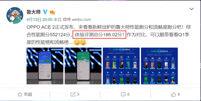 4月13日晚间,鲁大师测试了OPPO Ace2的流畅度。OPPO Ace2鲁大师流畅度跑分为186.02分,在2020年Q1季度手机流畅排行榜上排名第一,略高于OPPO Find X2 Pro。和Find X2 Pro一样,OPPO Ace2同样拥有高端旗舰配置。