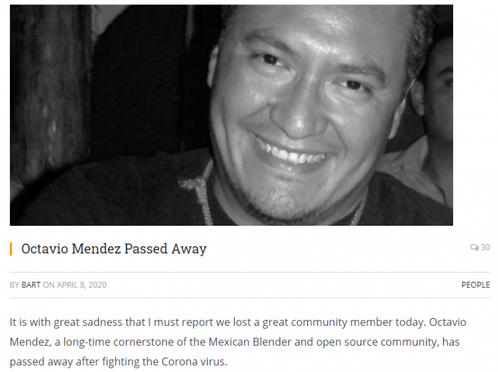 墨西哥 Blender 论坛 Blender Guanajato 的创始人 Octavio Mendez 因感染新冠病毒引起并发症而去世。Octavio 曾在墨西哥生活,并在此期间创建了一个论坛——名为 Blender Guanajato 的 Blender 社区。Octavio 通过论坛积极推广 Blender 项目以及向更多初学者传授如何使用开源 3D 图形工具 Blender。