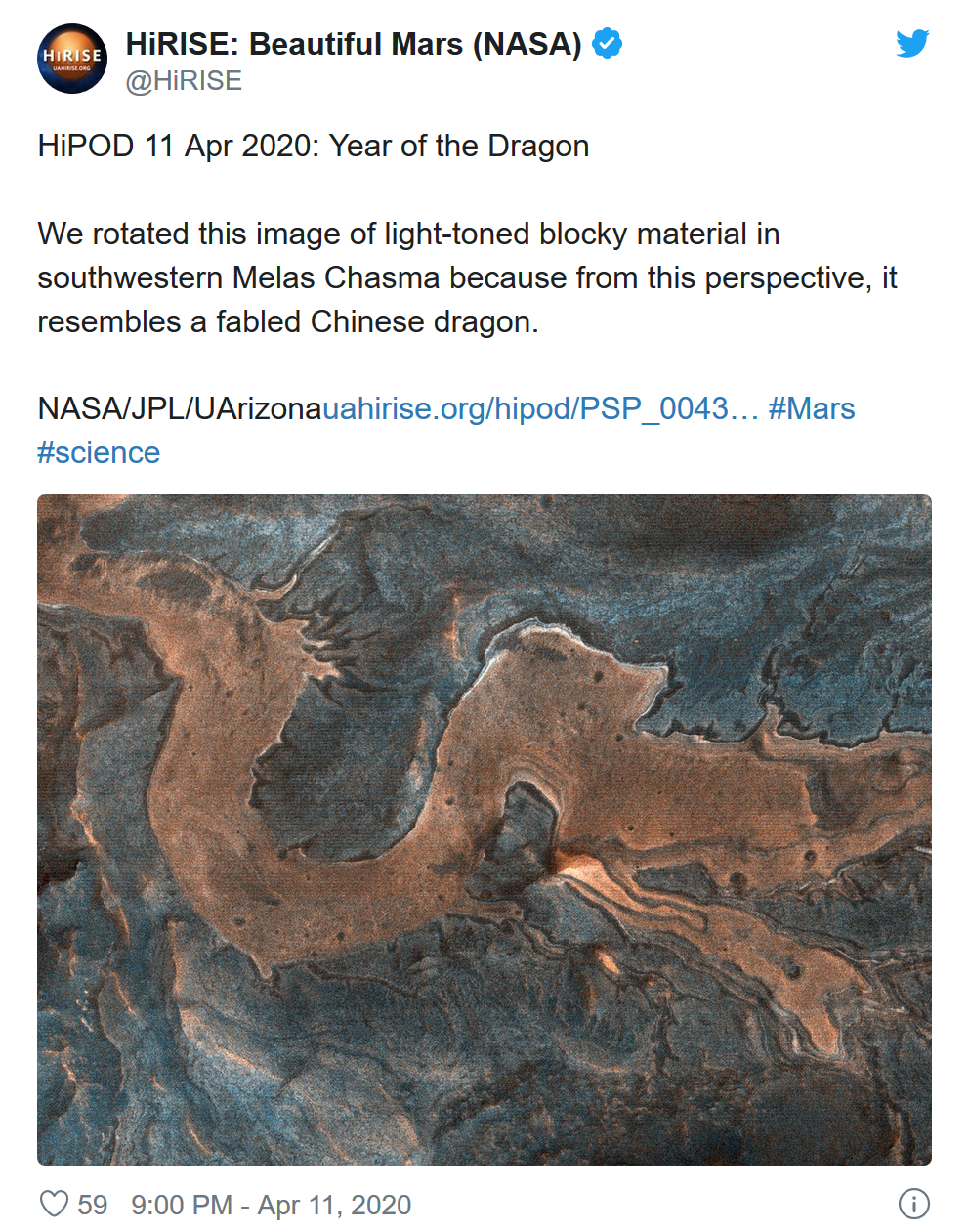 HiRise团队在周六在社交媒体平台分享了一张火星峡谷照,它在Twitter上发文称,这张照片拍到的画面来自米拉斯峡谷(Melas Chasma)西南方向,从拍摄的角度看这个峡谷看起来像极了传说中的中国龙。
