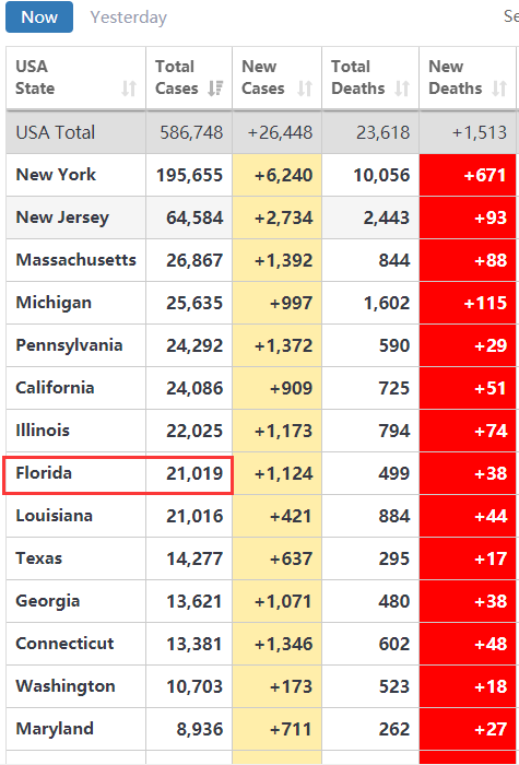 截至4月14日早8点半,约翰·霍普金斯大学更正数据,佛罗里达州累计确诊回落至2.1万例,美国累计确诊数回落至581679例——全球累计确诊数并未破200万。