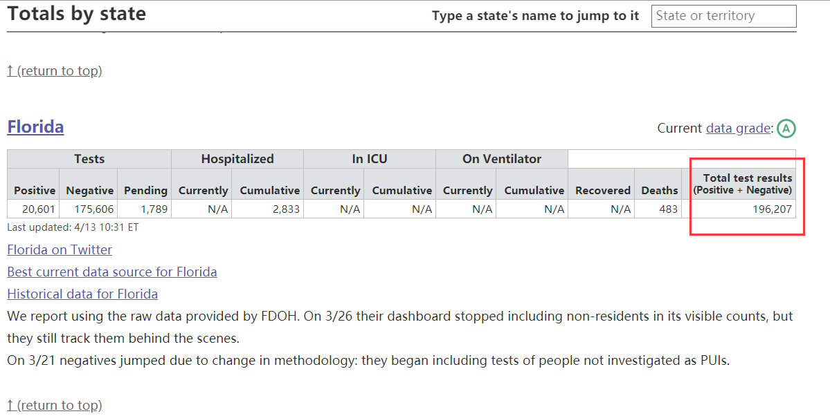 而约翰·霍普金斯大学数据显示佛罗里达州累计确诊已达12.3万,比其他平台、媒体统计数据多出10万。需要注意的是,约翰·霍普金斯大学“COVID-19跟踪计划”数据显示,该州总计接受核酸检测的人数,也只有19.6万人。按12.3万人确诊计算,该州的阳性率高达62.8%的阳性率,高出加利福尼亚州六倍。
