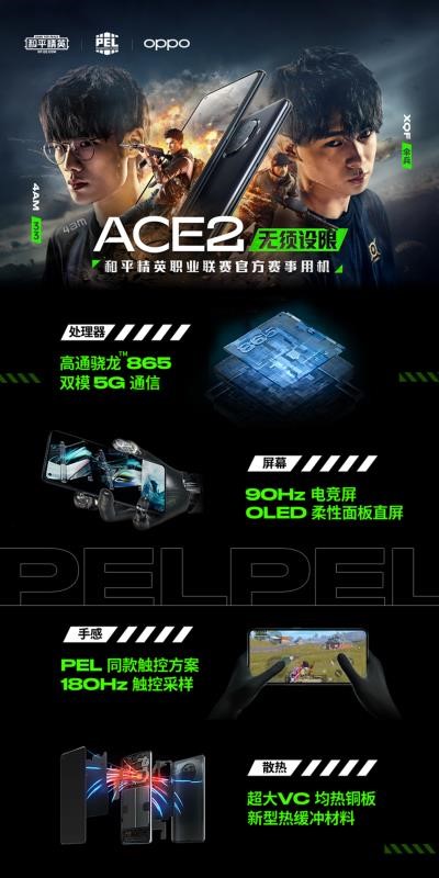 OPPO昨日正式发布新款OPPO Ace2手机,并宣布成为2020 PEL 和平精英职业联赛官方赛事用机。OPPO Ace2邀请超过 200 位内测玩家打了超过 12 万局比赛,最优方案放⼊均衡模式,OPPO 还与 PEL 选手联合测试,准备了一套专业的⼿感参数,融⼊到电竞模式中,与和平精英职业联赛官方联合优化,实现了稳定的 90FPS。