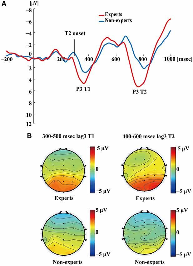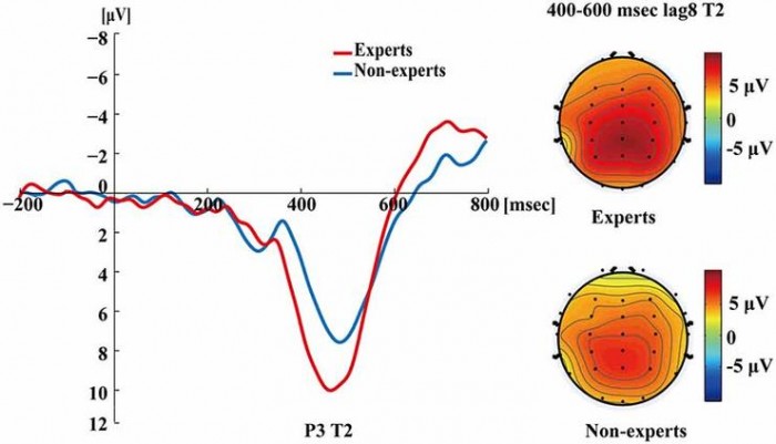 脑电图生理数据显示,游戏专家在注意瞬脱任务中 P3 峰值潜伏期较早,这说明相对于非游戏专家的志愿者,游戏专家能够更有效地检测目标。