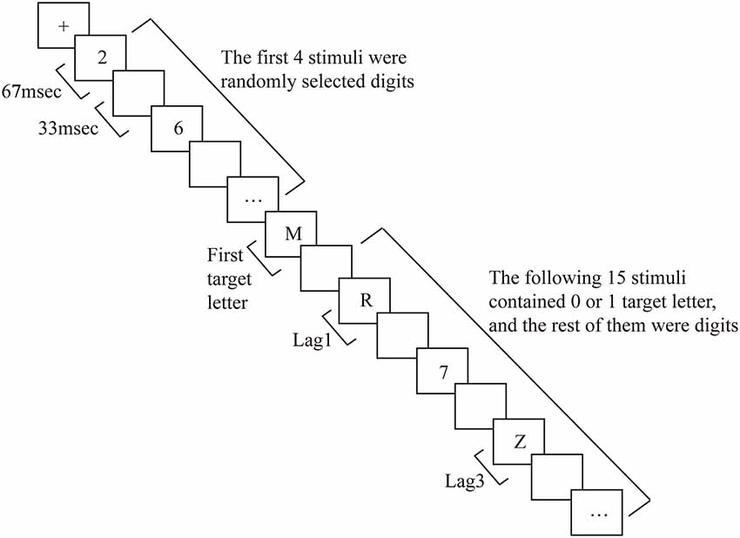 志愿者被要求坐在电脑屏幕前完成注意瞬脱任务,电脑显示器会呈现快速的数字和字母流,时间间隔为 100 毫秒。在目标对象出现时,志愿者要即时按下按钮。不得不说,这实验看起来像极了金山打字的入门游戏。