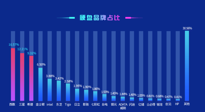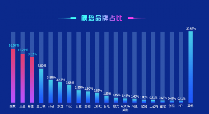 品牌方面,西数、三星、希捷继续占据第一集团领跑,份额分别为16.57%、12.21%、9.32%,之后是金士顿、Intel、东芝、金泰克(Tigo)、日立、影驰、七彩虹、台电等等。