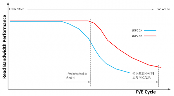 或者说在相同纠错失败概率(UFER)要求下,4K LDPC能容忍更高的闪存颗粒原始误码率(RBER),从而可以大大延长闪存的使用寿命。