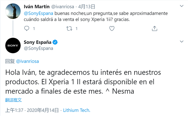 4月15日消息,索尼西班牙官方推特在与网友互动时确认,Xperia 1 Ⅱ将在本月晚些时候上市,售价1200欧元(约合人民币9300元)。核心配置上,索尼Xperia 1 Ⅱ采用6.5英寸21:9 4K HDR OLED带鱼屏,分辨率为3840×1644,搭载高通骁龙865旗舰平台,配备8GB内存+256GB存储,前置800万像素,电池容量为4000mAh,支持IP68级防尘防水。