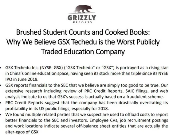 早在今年 2 月底,做空机构 Grizzly 就发布了一份做空报告,称跟谁学财务造假,2018 年虚增 74.6% 盈利、刷单伪造学生数量、老股东抛售股票等。面对这份报告,跟谁学只表示“对于这种主观臆断、逻辑混乱的报告不需要评价。