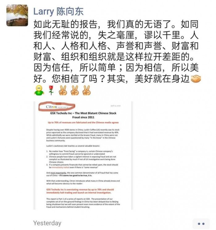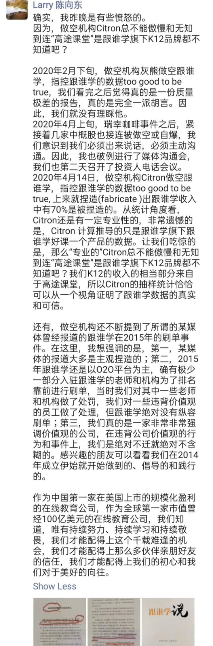 4月15 日上午陈向东在朋友圈中再次回应香橼时指出,这一做空报告中的核心观点“跟谁学业绩 70% 为虚构”一事是被捏造的。香橼计算推导的只有跟谁学旗下的跟谁学好课这一个产品数据,“令我们吃惊的是,‘专业的’Citron(香橼)总不能傲慢无知到连‘高途课堂’是跟谁学旗下 K12 品牌都不知道吧?我们 K12 的收入相当部分来自于高途课堂,所以Citron的抽样统计恰恰可以从一个视角证明了跟谁学数据的真实可信。”