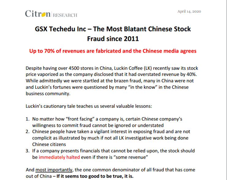 跟谁学还在继续“接雷”,继 2 月份被指做空后,跟谁学再次被指做空。4月14日晚间,做空机构香橼发布了 36 页的跟谁学做空报告,报告称跟谁学是 2011 年以来最大的中概股造假案,称其虚增营收 70% ,应该立即停止交易并开展内部审查。由于疫情导致更多实地调查结果报告被推迟,所以这次发布的是第一部分内容,第二部分将提供更多权威信息。