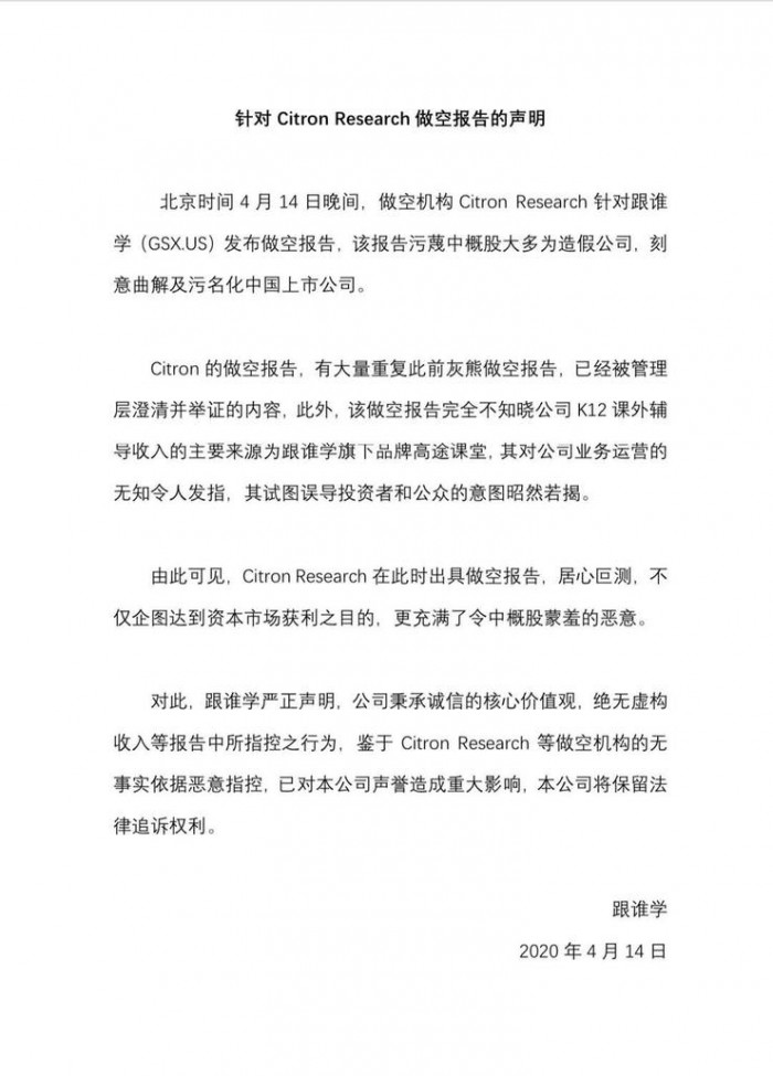 跟谁学官方连夜发表声明表示,绝无虚构收入等报告中所指控之行为。香橼大量重复此前灰熊做空报告,已经被管理层澄清并举证的内容。此外,该做空报告完全不知晓公司 K12 课外辅导收入的主要来源为跟谁学旗下品牌高途课堂,其对公司业务运营的无知令人发指,其试图误导投资者和公众的意图昭然若揭。鉴于做空机构的无事实依据恶意指控,已对本公司声誉造成重大影响,本公司将保留法律追诉权利。