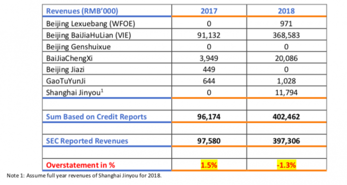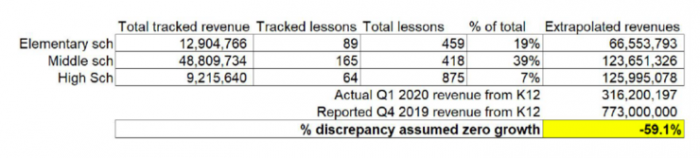 3、香橼跟踪调查了跟谁学超过 20% 的课程,估计跟谁学 2019 年的收入被夸大了 70% 。