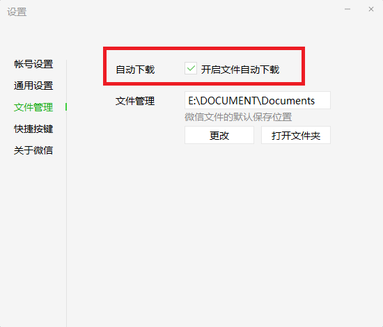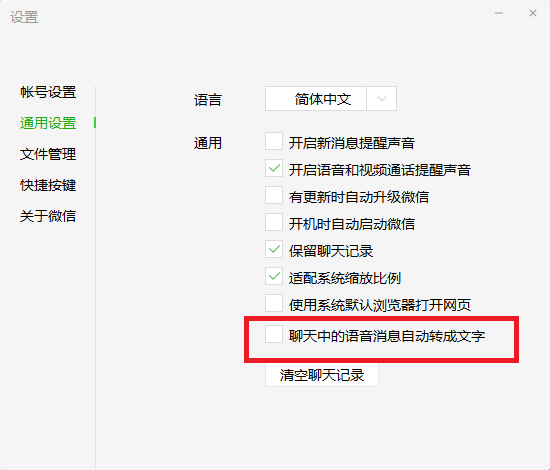 功能设置方面,可以设定将聊天中的语音消息自动转为文字(默认关闭),可以设定收到的文件是否自动下载(默认开启),建议后一项设为关闭,以节省本地电脑空间,此时收到的文件旁边会出现一个下载标记,点击才会存到本地。