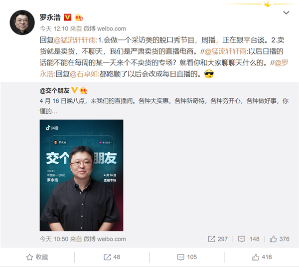 锤子科技CEO罗永浩今年开始涉足电商直播带货,现在要开始做脱口秀了。4月15日消息,罗永浩在与网友互动时透露,以后会做一个访谈类类的脱口秀节目,计划每周一播,正在跟平台沟通合作。