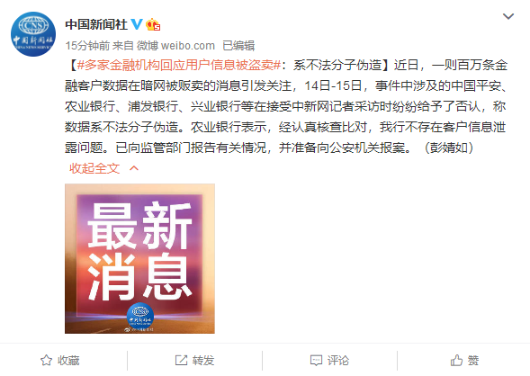 农业银行表示,经认真核查比对,我行不存在客户信息泄露问题。已向监管部门报告有关情况,并准备向公安机关报案。