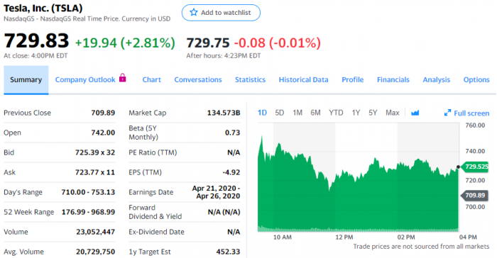 汽车行业咨询机构LMC Automotive的数据显示,3月份中国市场特斯拉汽车注册量环比2月份增长450%。受疫情影响,3月份中国汽车销量下降43.4%。在星期二晚些时候发布的投资报告中,高盛分析师马克·德兰尼(Mark Delaney)将特斯拉纳入研究范围,并给出864美元目标股价,比星期三收盘价高出18%。投资报告称,“我们认为,以下多个因素将有助于特斯拉维持强劲的市场地位:产品领先优势(包括通过无线方式发布更新包提升汽车性能的能力)、先发优势、垂直整合,以及汽车产品开发周期较长。”长期以来,华尔街对特斯拉的看法就颇为不一致。支持者预计特斯拉将成为一家具有主导地位的全球汽车厂商,但也有许多人怀疑特斯拉能否盈利。高盛上一任特斯拉分析师大卫·塔姆伯林诺(David Tamberrino)对特斯拉股票评级为“卖出”,目标股价定为158美元(去年6月)。特斯拉股价与3月低点相比翻了一番,但仍然比2月份创记录的高点低20%。今天常规交易中,特斯拉股价上涨19.94美元,涨幅为2.81%,报收于729.83美元。