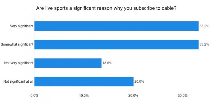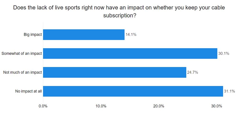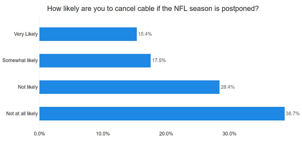 近日Kill the Cable Bill和Mindnet Analytics两家机构就这个问题,对有线电视用户进行了调查。结果发现了一个相当悲观的数据:如果NFL赛事被推迟,那么大约有三分之一的有线电视用户有可能会取消订阅。