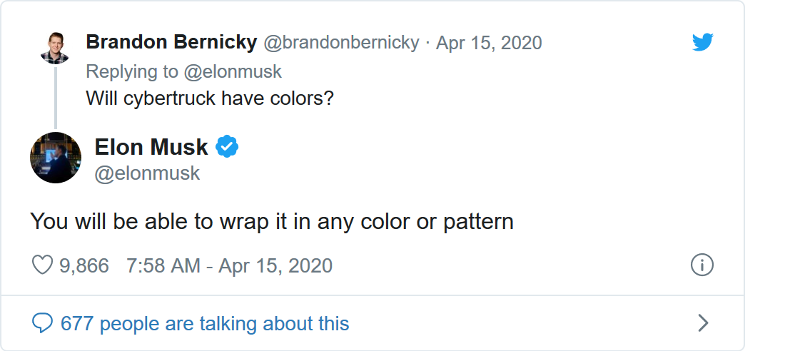 不过现在看起来这个计划可能已经改变,因为马斯克暗示,如果要改变Cybetruck车身的颜色则需要把车身包起来。