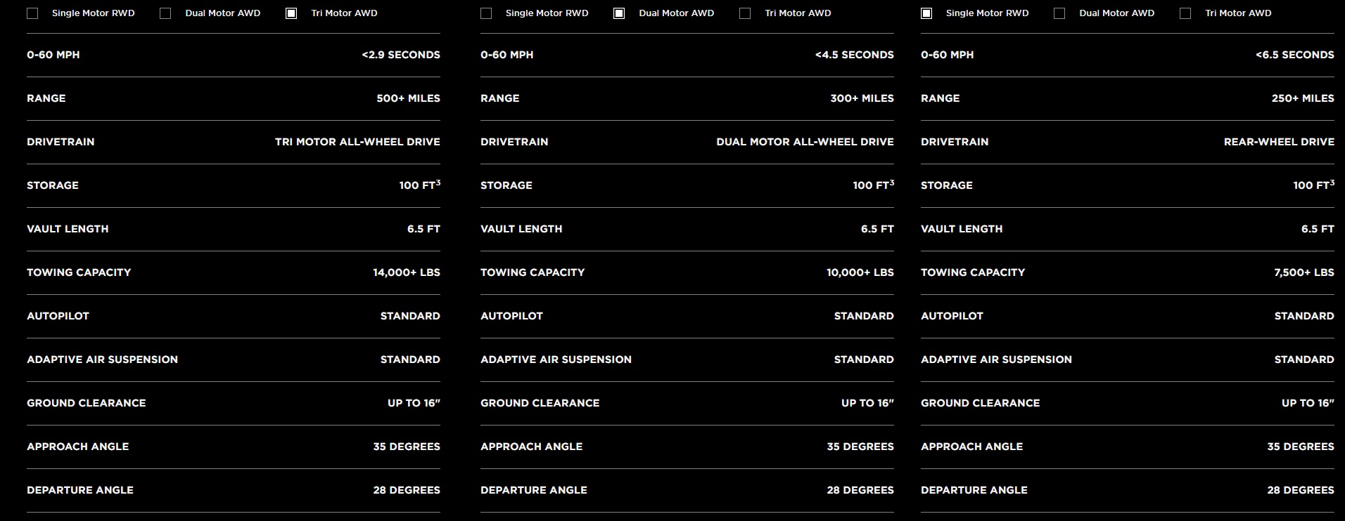 据了解,Cybertruck将有三个动力系统版本供消费者选择:单电机全驱版、双电机前驱版和三电机前驱版。其中,单电机全驱版起售价39,900美元,双电机前驱版和三电机前驱版分别为49,900美元和69,900美元。若想配备自动驾驶单元则需另外支付7000美元。