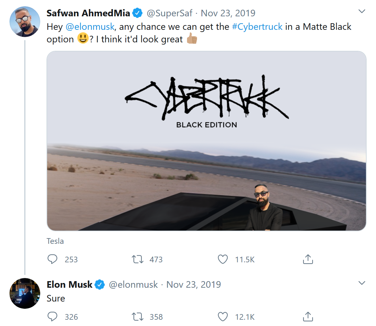马斯克:可以选择Cybertruck配色 但需要车身贴膜