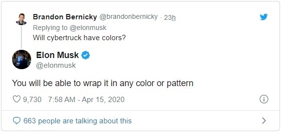 4月16日消息,特斯拉CEO马斯克在推特上回复消息称,要想改变Cybertruck皮卡车的外观颜色,需要车主自己动手进行贴膜或者喷漆。