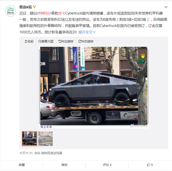 目前,特斯拉皮卡Cybertruck已在国内开放预订,订金为1000元人民币,并有包括单电机后轮驱动、双电机全轮驱动及三电机全轮驱动三种版本。截止到今年2月份,Cybertruck的预定数量已经超过了50万辆。