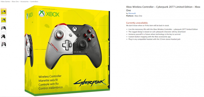 《赛博朋克2077》作为今年数一数二的焦点大作,可以预见各大硬件厂商会推出各种限定周边主机或外设。而日前有玩家发现加拿大亚马逊已经上架了一款《赛博朋克2077》主题Xbox无线手柄,很可能是亚马逊又一次赶在微软官宣之前泄露天机。