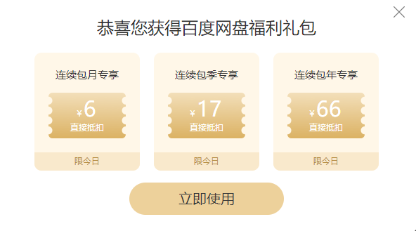 在Pandownload作者被抓之后,百度网盘今天意外地发了一个福利礼包,连续包月可以直接抵扣6元,连续包季可以折抵17元,包年则可以折抵66元。