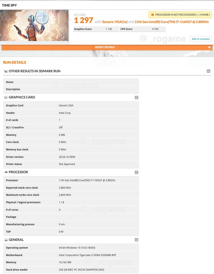 现在,著名硬件曝料博主@_rogame 又挖掘到了一款Tiger Lake-U家族的新品“酷睿i7-1165G7”,看编号显然比i7-1185G7低端一些,但奇怪的是检测到的基准频率为2.8GHz,反而高了100MHz,二者同样都是4核心8线程,G7也代表核显规模是一致的,频率可能有所不同。