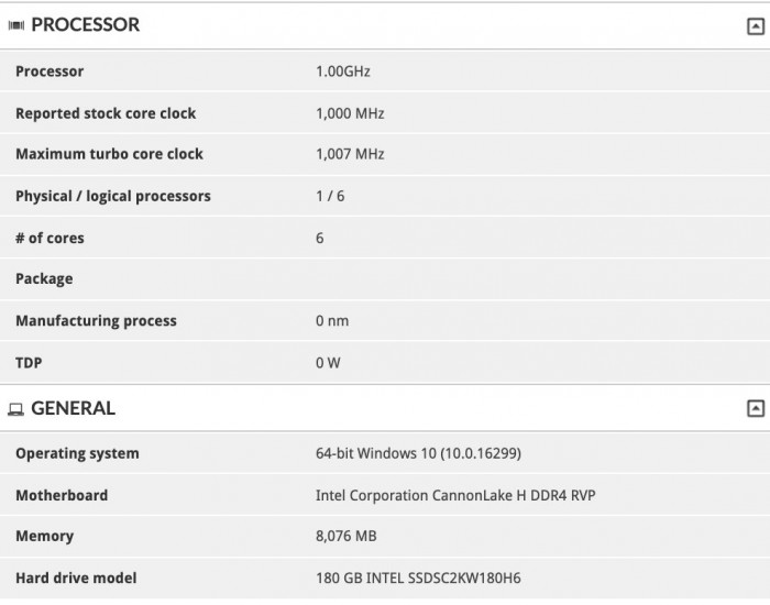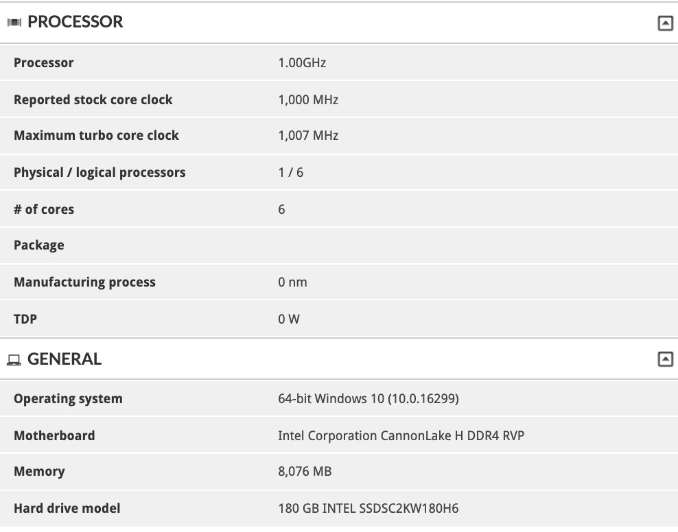 再来看两款Cannon Lake-H高性能系列,之前从未曝光,一是6核心6线程,基准频率仅仅1GHz,而且未开启核显,自然是个不合格产品。