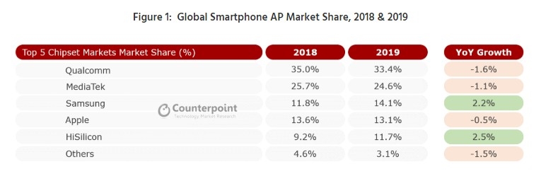 如果要评手机的三大件,SoC、屏幕、相机应该会得到多数人的赞同。统计机构Counterpoint Research出具的智能手机AP(应用处理器,相对于BP基带而言)份额榜单显示,高通目前仍旧牢牢把持市场份额第一。不过,从2018年到2019年,高通的份额略有下滑,即从35%降至33.4%。