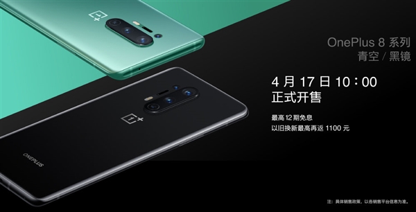 一加8 Pro手机将在4月17日10:00正式开售,最高12期免息分期,以旧换新可以折抵1100元。