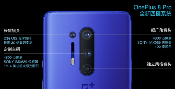 拍照方面,一加8 Pro一共使用了4颗镜头,主摄是4800万像素IMX689传感器,F/1.7大光圈,广角是4800万像素IMX586传感器,F/2.2光圈,支持120°超广角及3cm微距。