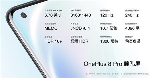今年的一加8系列使用的是打孔屏,官方称之为瞳孔屏幕,一加8 Pro使用了6.78寸AMOLED屏,E3材料,3168x1440分辨率,120Hz刷新率,触控采样率240Hz,支持HDR10+认证,10bit色阶,可显示10.7亿色彩。