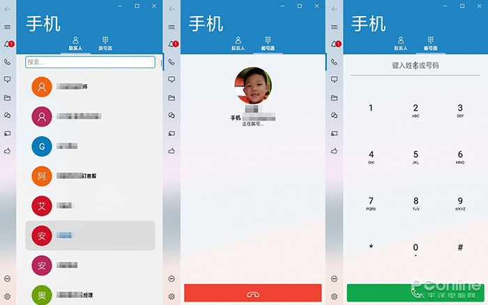 “手机”对应于电话和通讯录,比方说我们要搜索联系人、拨打电话,或者收发短信,都可以利用这项功能。不过这里只提供了简单的拨号与挂断,实际通话还要通过手机完成,电脑端的麦克与音箱并不起作用,使得这项功能多少变得鸡肋了一些。