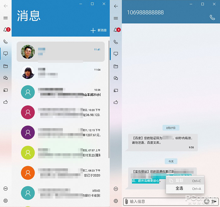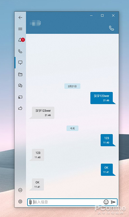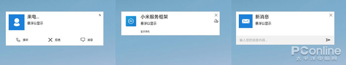 无论手机收到一条短信、微信还是邮件,PC端都能同步得到通知。这个通知是可以点击的,比方说收到一条短信后,除了可以直接进入短信界面外,悬窗下方也会有一个快速回复面板。你可以通过这里,回复短信或者直接挂断电话。