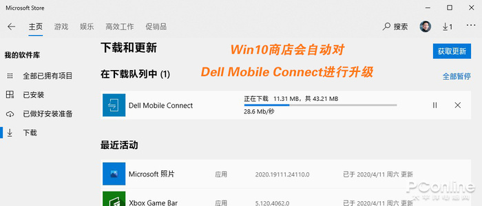 4) 打开Win10应用商店,点击右上角“…“→”下载与更新“,正常情况下商店会对Dell Mobile Connect自动完成更新。如果没有弹出更新界面,那就手工点击一下右上角的”获取更新“按钮,看到下面这个界面就对了;