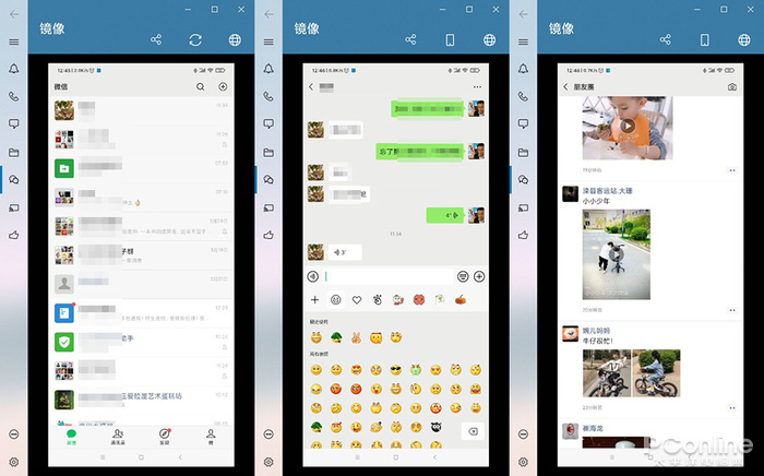 微信其实是“镜像”功能的一个快捷方式,点击后会自动镜像屏幕并打开微信。由于是屏幕镜像,因此所有操作和手机端微信没有差别,我们可以借助键盘和鼠标,快速完成信息的显示与发送。不过实际应用中,这项功能却并没有想像中好用,主要原因是实体鼠标在操作时总有一段误差,使得点击不够精确。而且和打电话一样,语音信息也是发不了的,同样需要借助手机端操作。