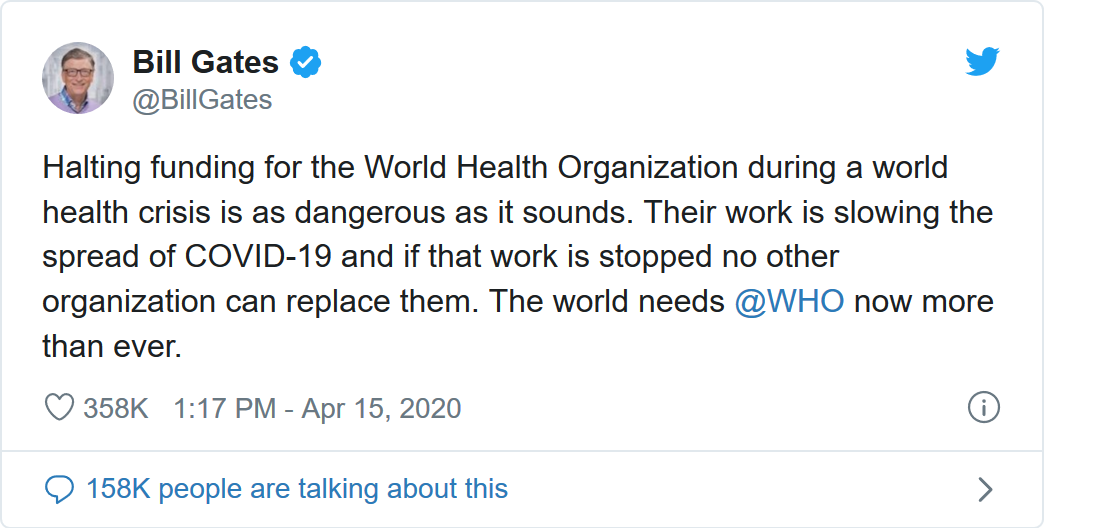 特朗普指出,世卫组织没有采取相应的行动应对疫情,美国将在解除对资金的封锁之前重新审查向世卫组织提供的资源。针对特朗普的这一决定,盖茨发推文指责并称这听起来非常危险。盖茨指出,世界现在比以往任何时候都更需要世卫组织。在2018- 2019年期间,美国向世卫组织提供了4亿美元(其中包括1.1亿美元的分摊会费),以微弱优势成为主要捐助国。