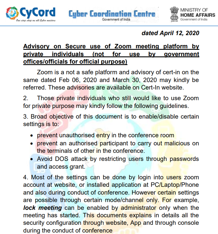 "Zoom是一个不安全的平台,"印度内政部的网络协调中心(CyCord)在一份长达16页的咨询中说。"平台不适合政府官员用于官方目的,"印度新闻局在一份声明中说。该咨询意见包括为那些仍希望使用Zoom进行私人通信的用户提供指引。
