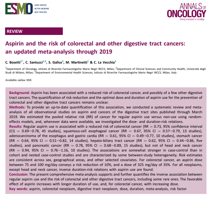 由意大利研究人员团队领导的一项新研究提供了迄今为止进行的最大的元分析,重点研究了长期使用阿司匹林和减少消化道癌发病率之间的非常具体的关系。该分析汇集了113项观察性研究的数据,涵盖了肠癌、胰腺癌和肝癌等癌症。