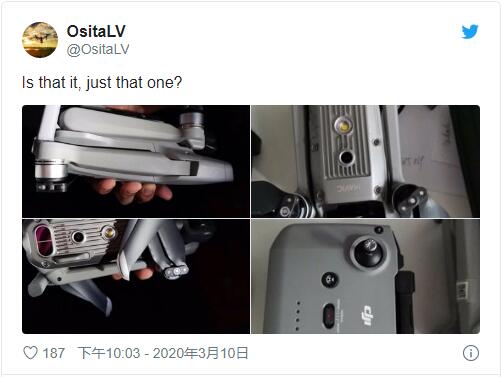 除了认证信息和说明书,网友 @OsitaLV 还曾于 3 月 10 日在 Twitter 上分享了 Mavic Air 2 的另一批谍照。