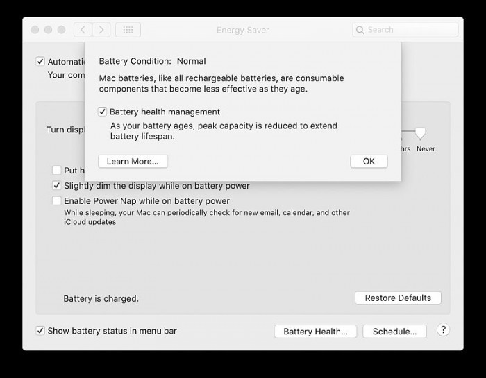 现代笔记本电池充电至 100%,并长时间放置在那里,尤其是在比较高的温度下,会大大降低电池的使用寿命。苹果决定调整MacBook 默认电池充电行为,使其在某些情况下不至于太过极端地将电池完全充电,以延长电池寿命。