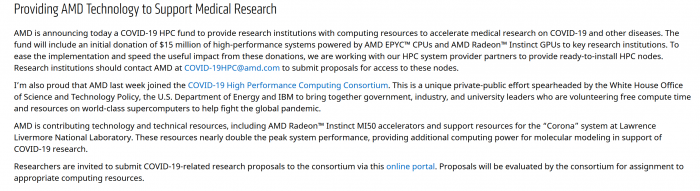 其实在上周,AMD还加入了由白宫科学政策办公室、美国能源部、IBM牵头的COVID-19高性能计算联盟,自愿免费为对抗新冠疫情蔓延提供算力支持。