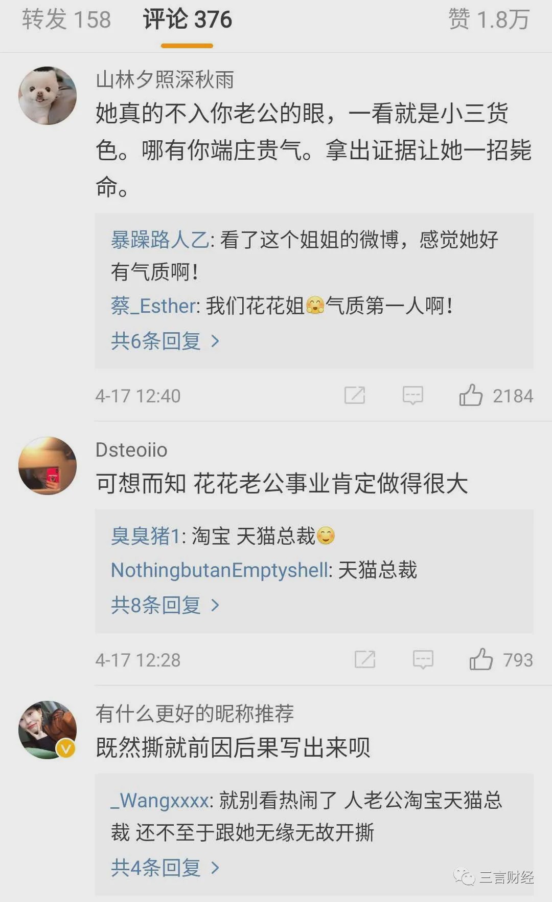 4月17日,一位id为花花董花花的网友发微博向网红张大奕喊话:“再来招惹我老公我就不客气了,老娘也不是好惹的。”而该网友疑似天猫总裁蒋凡的夫人。而蒋凡是天猫淘宝阿里妈妈事业群总裁。
