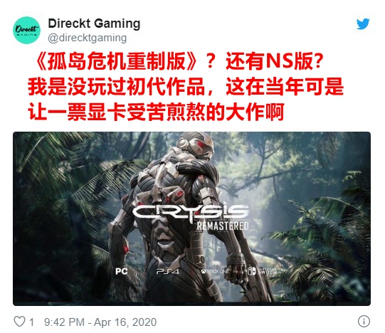 今日(4月17日),《孤岛危机》“复活”的官方推特官宣了《孤岛危机:复刻版》,游戏将登陆PC、PS4、Xbox One和Switch平台,NS版由之前负责移植《巫师3》的Saber Interactive打造。一听说《孤岛危机:复刻版》有NS版网友的想象力就开始爆棚,一众沙雕立马如浪花般袭来。
